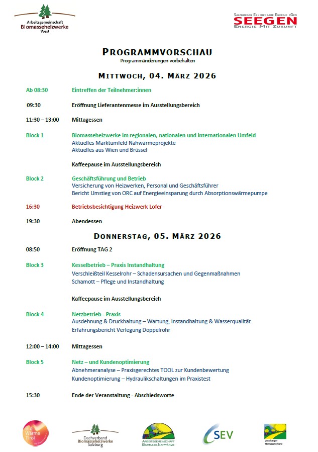 Am Mittwoch widmen wir uns dem aktuellen Marktumfeld, Neuigkeiten aus Wien und Brüssel sowie Geschäftsführungsthemen. Abgerundet wird der Tag durch eine Betriebsbesichtigung des Heizwerks Lofer.